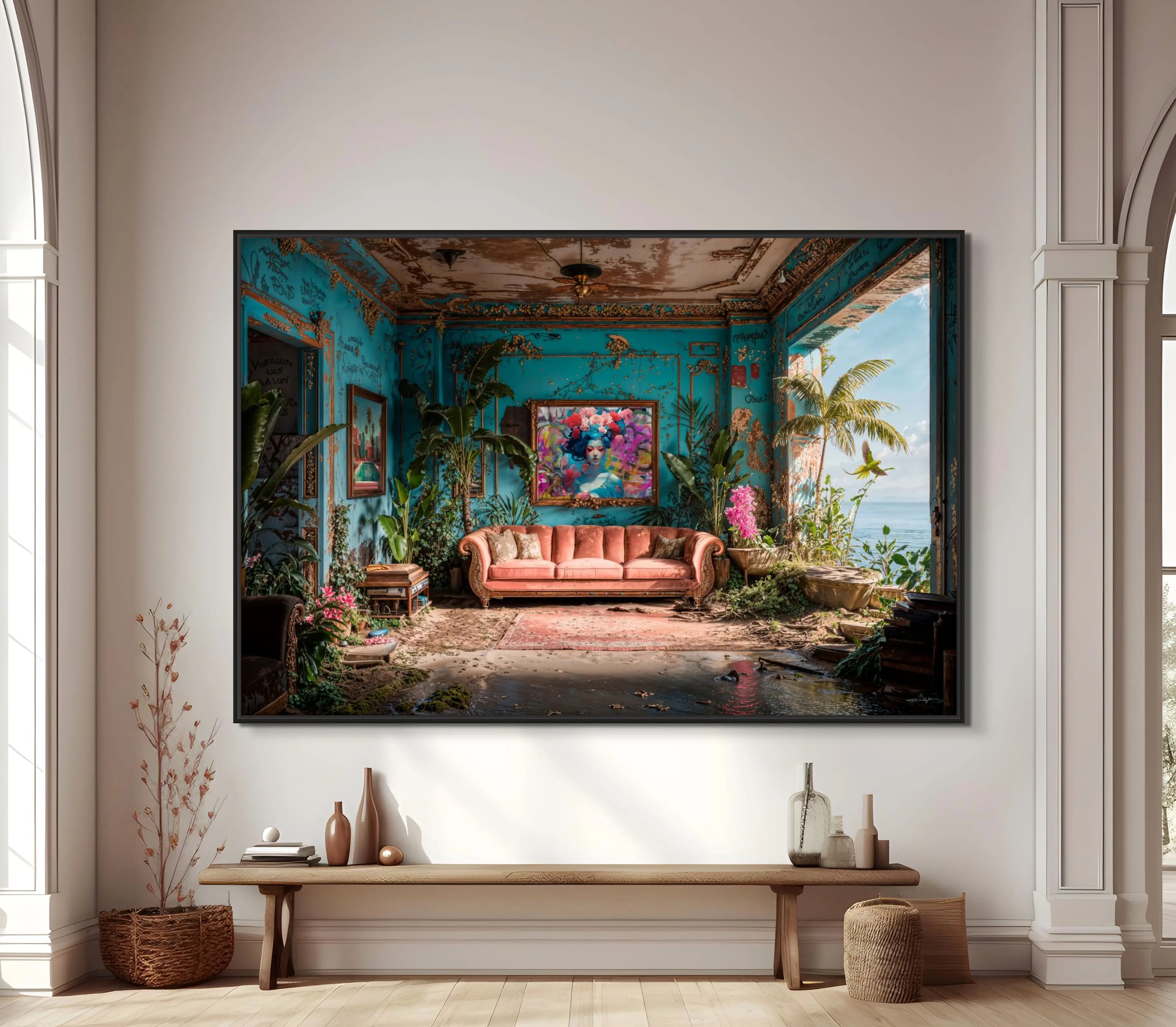 Dans cet intérieur laissé au silence, la nature reprend doucement ses droits. Entre murs décrépis et éclats de graffiti, la lumière de l’océan s’invite comme une promesse d’évasion. Les plantes luxuriantes, les oiseaux et l’horizon infini transforment la ruine en refuge onirique, où l’abandon devient renaissance et où le chaos dialogue avec la beauté.